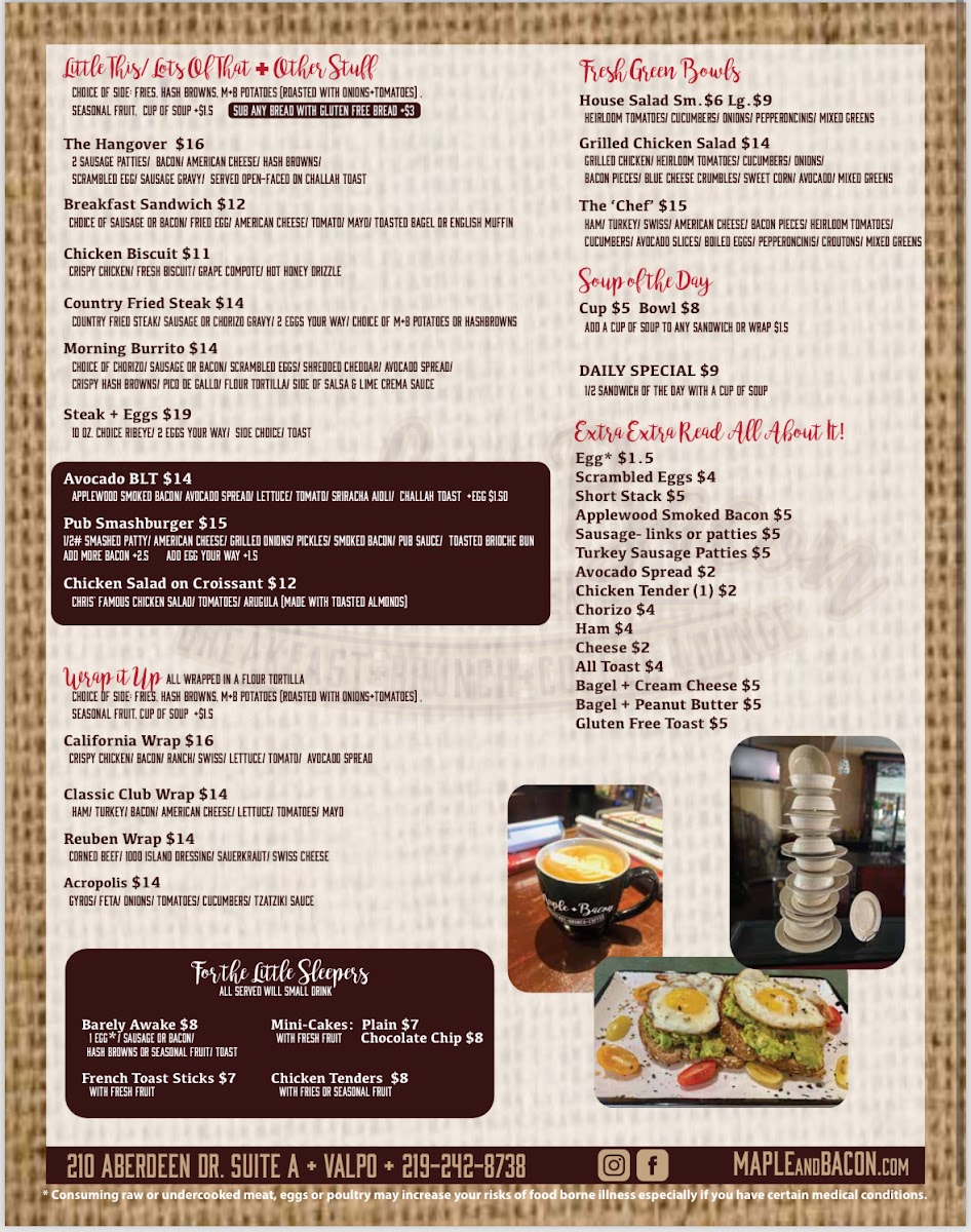 Welcome to Maple Bacon, nestled in Valparaiso, IN, where breakfast dreams come true! This charming eatery specializes in hearty, mouth-watering delights, showcasing a menu designed to satisfy all taste buds. Select from a variety of egg styles, each cooked to your preference, and crafted with local ingredients for a wholesome experience.
